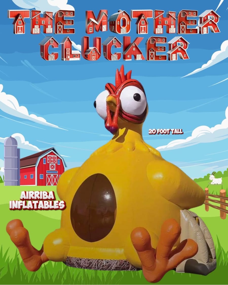 The Mother Clucker is a show-stopping, 20-foot tall giant chicken designed to draw crowds and delight kids. This towering mascot features a clear vinyl front so guests can see into or out of the structure. It’s an eye catcher that boosts event visibility and keeps families entertained. Perfect for fairs, festivals, grand openings, and promotional events. 🎉