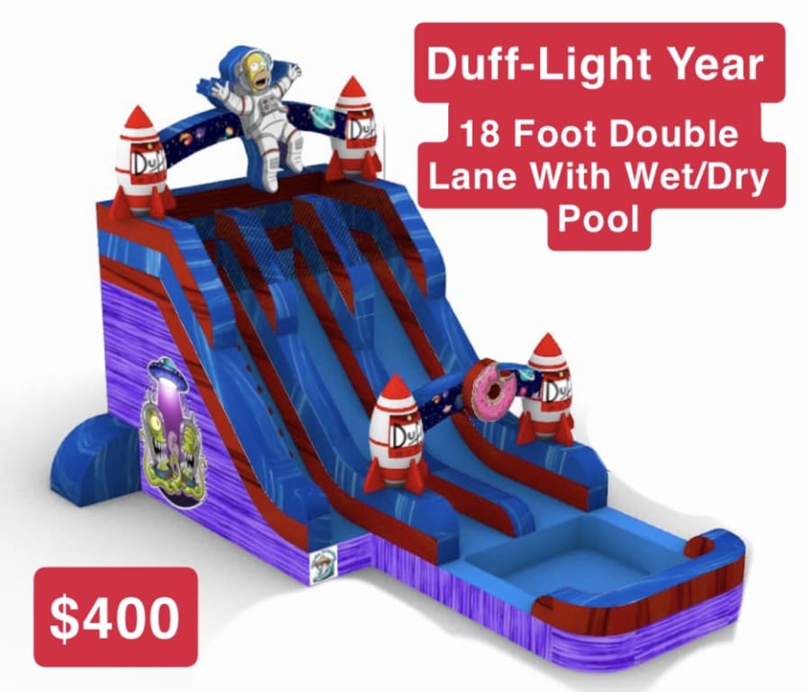 Bring big thrills to your next party with the Duff-Lite Year inflatable. This 18-foot tall, double-lane water slide delivers a space-themed Duff rocket ride complete with Homer at the top. Wet or dry, it’s built for kids, adults, dads, and Simpsons fans who want bold photos and nonstop fun. 🎉